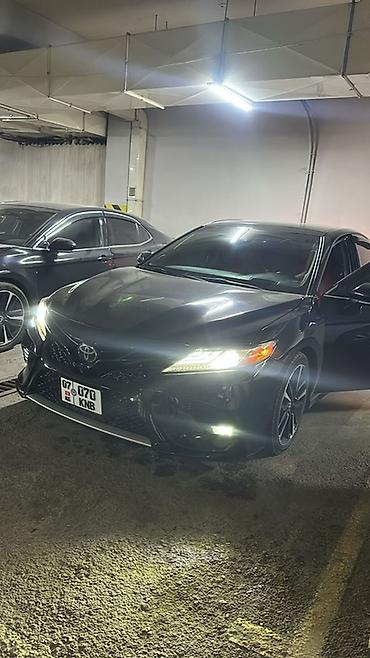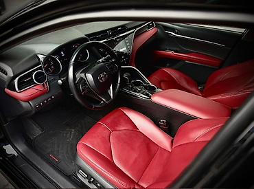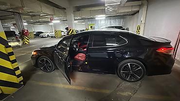 Toyota Camry, черный седан бизнес-класса с ярким спортивным пакетом.