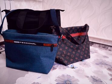 - Сумки‑тоуты разных расцветок: черный, джинсово‑синий, с принтом под монограмму и контрастной красной полосой. Есть варианты с плечевым ремнем, наружными карманами и верхней молнией.