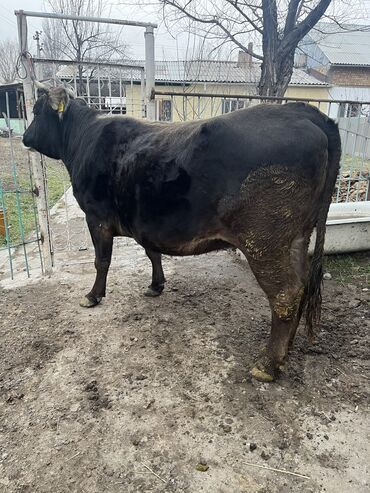 Телка семя Швиц. Возраст 15 месяцев вес 480 кг. На фото её мать черно пестрая давала 32 литра молока. Телка была осеменена 27 ноября 2025 года. Находится в городе Талас