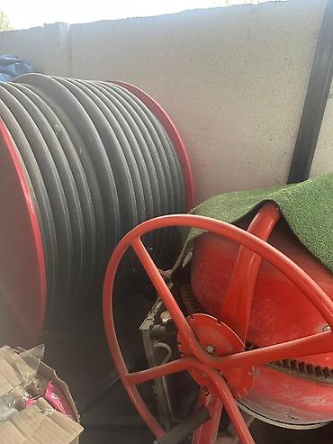 - Длинный толстостенный рукав-водовод (шланг) на намотке — подходит для подачи воды на большие расстояния, для полива полей, садов, огородов, мойки площадок и др.