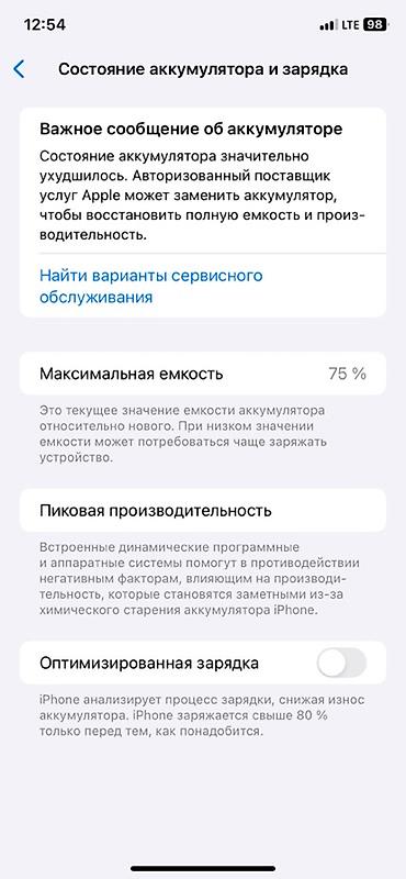 - Аккумулятор: в меню «Состояние аккумулятора» отображается максимальная ёмкость 75%; включена функция «Оптимизированная зарядка».