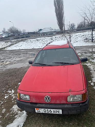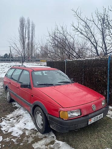 Volkswagen Passat Variant (универсал), красный цвет. Кузов универсал с рейлингами на крыше, 5 дверей. Передняя оптика прямоугольная, бамперы неокрашенные, стальные колёса с колпаками. Задние форточки и боковые окна с заводской формой остекления, дворники передние, наружные зеркала черные. Номерные знаки формата KG.