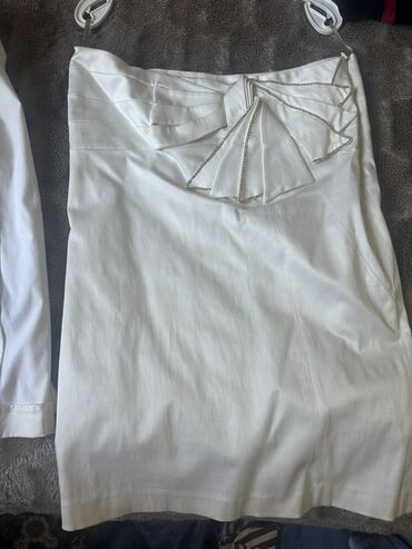 Белый женский костюм с ремнем. - Комплект из двух предметов: безрукавной удлиненной блузы с асимметричными полами и прямых широких брюк. - Цвет: молочно-белый. - Посадка брюк: высокая, свободный с...