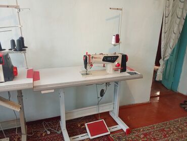 - Установлена на прочном регулируемом столе с металлической станиной и ножным педальным приводом.
