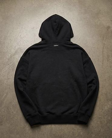Черное худи с капюшоном и карманом-кенгуру. Прямой крой, шнурки на капюшоне с металлическими наконечниками. На груди — крупный светоотражающий принт в овальной рамке с силуэтом корабля. Мягкий плот...