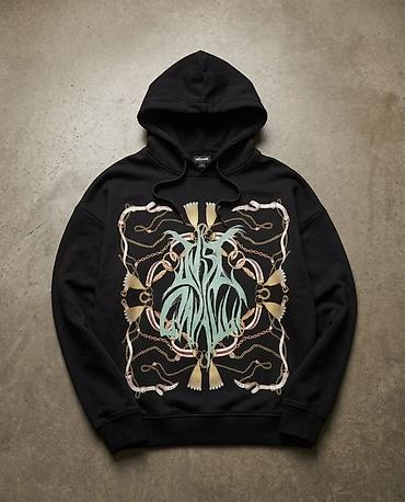 Стильная тёплая толстовка с капюшоном от Just Cavalli с выразительным дизайнерским принтом на передней части; спинка — однотонная. Отлично сочетается с джинсами и кроссовками для повседневных образов.