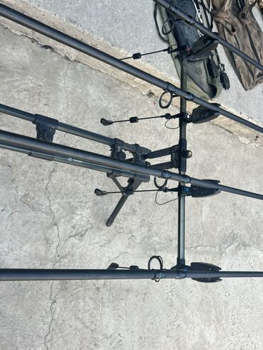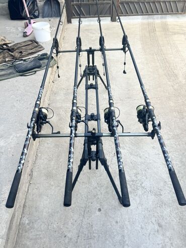 - Род-под на треноге с передней и задней перекладинами на 4 удилища, регулируемая высота и вылет, крепления под сигнализаторы.