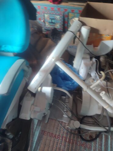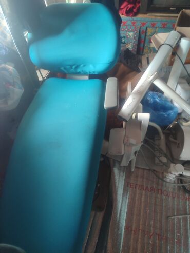 - Кресло пациента с подголовником и подлокотниками, обивка бирюзового цвета.
