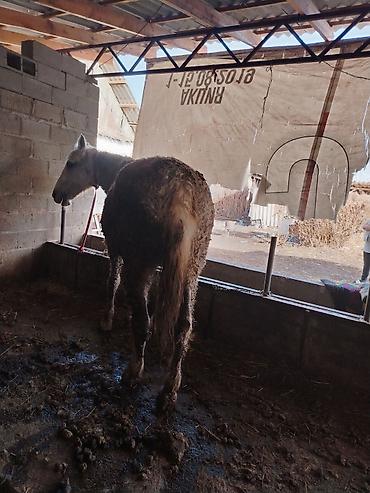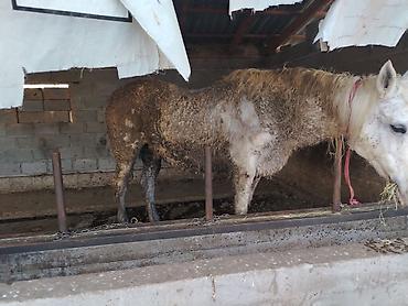 Лошадь (масть серая), взрослое животное. На фотографиях — кобыла крупного телосложения с прямым профилем, густой гривой и хвостом. Стоит в крытом стойле из шлакоблока с деревянными балками и металлической крышей; привязь — цепь с карабином на стойках. Кормится сеном. Подходит для хозяйственных нужд, выпаса и упряжи (при соответствующей подготовке). Требуется уход: чистка, регулярное вычесывание шерсти, поддержание сухости подстилки, плановые копытные и ветеринарные процедуры. Отлично переносит стойловое содержание и легко привыкает к распорядку.