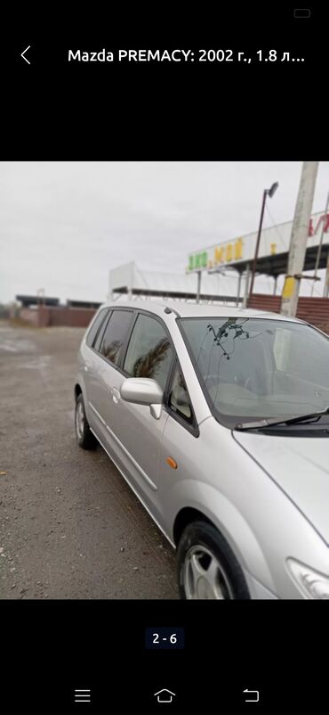 Mazda Premacy, серебристый компактвэн (5 дверей). Кузов и экстерьер: - Серебристый цвет, заводские рейлинги на крыше - Тонированные боковые и заднее стекла - Противотуманные фары в переднем бампер...