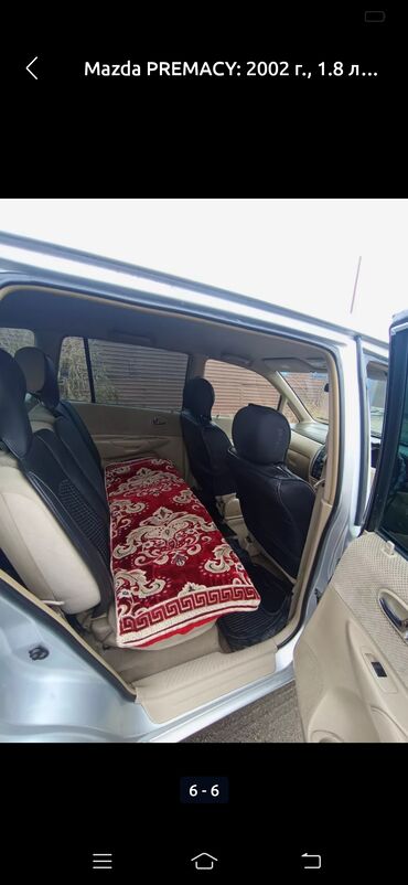 СправаМинивэн Mazda Premacy 2002 года выпуска с двигателем объемом 1.8 литра. Автомобиль серебристого цвета, оснащенный черными сиденьями и декоративными накидками красного цвета с узором. Салон автомобиля просторный, что делает его удобным для семейных поездок и перевозки грузов. Руль с логотипом Mazda, а также приборная панель выполнены в светлых тонах, что придает салону дополнительный объем. Модель Premacy известна своей надежностью и практичностью, подходит как для повседневного использования, так и для дальних путешествий.