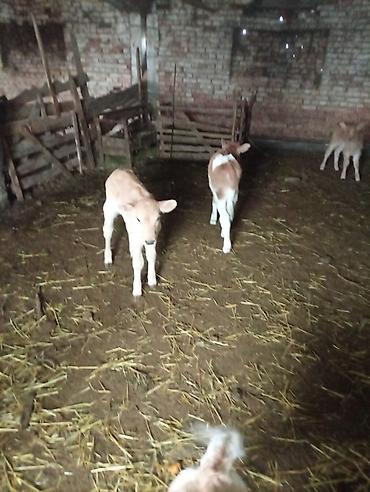 Продаются телята (молочного направления). На фото — молодняк светло-рыжей масти с белыми отметинами. Содержатся в стойле, активные, ровные по экстерьеру.