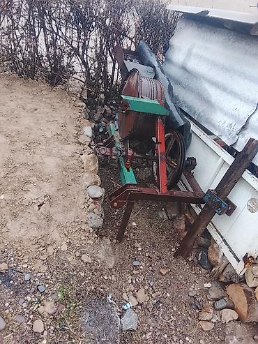 - Вторая стационарная корморезка/соломорезка на металлической стойке, с ременным шкивом привода, загрузочным лотком и барабаном.