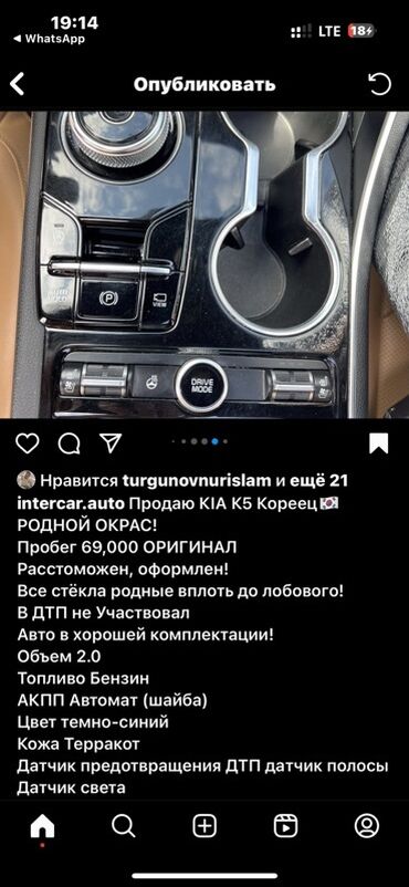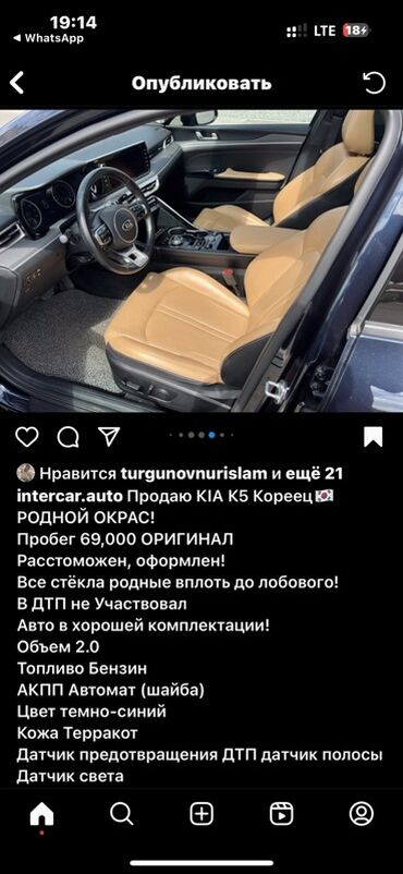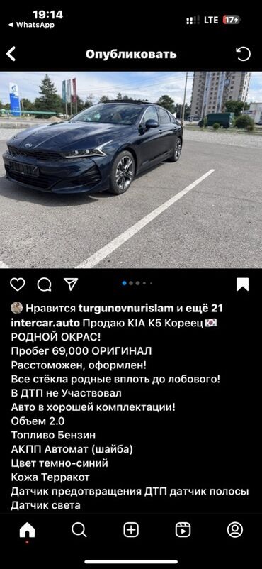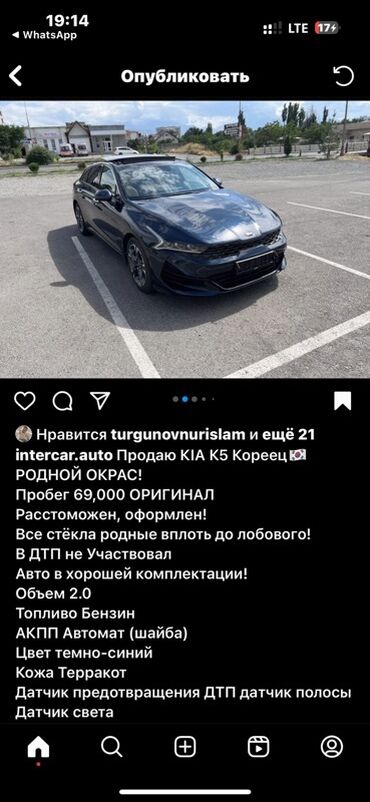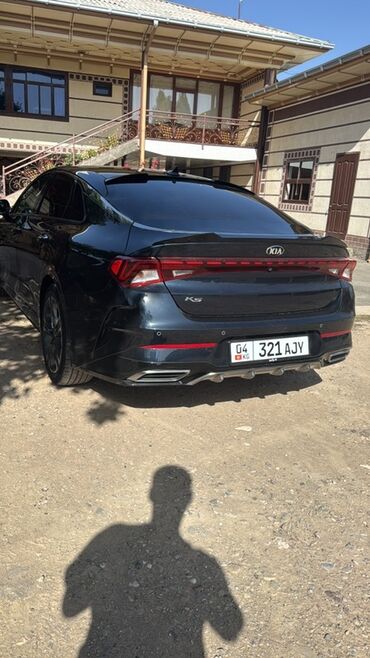 Kia K5 (Korea). Темно-синий седан с эффектной светодиодной оптикой и панорамной линией задних фонарей. Номерной знак KG 321 AJY.