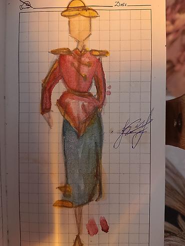 - Авторские скетчи модных женских образов, выполненные акварелью и цветными карандашами на разлинованных листах блокнота.