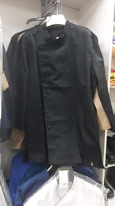 - Куртка поварская (черная): стойка-воротник, асимметричная застежка на пуговицы, длинный рукав. Практичная ткань, выдерживает частые стирки, сохраняет цвет.