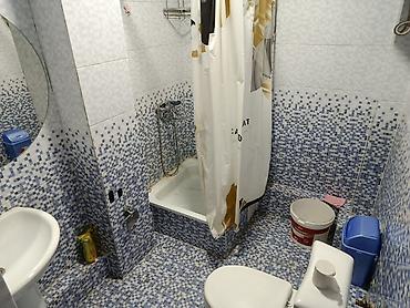 - Санузел совмещенный: душевая кабина-поддон со шторкой, умывальник, унитаз, зеркало, настенные полки.