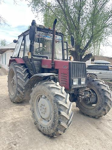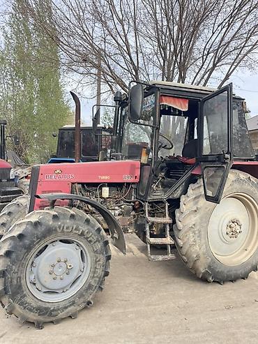 Маркировки на борту: BELARUS 892, TURBO. На фото видны колеса с агропротектором, комплект задней навески и интерьер кабины.