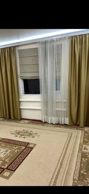 - Окна с римской шторой и тюлем, плотные портьеры.