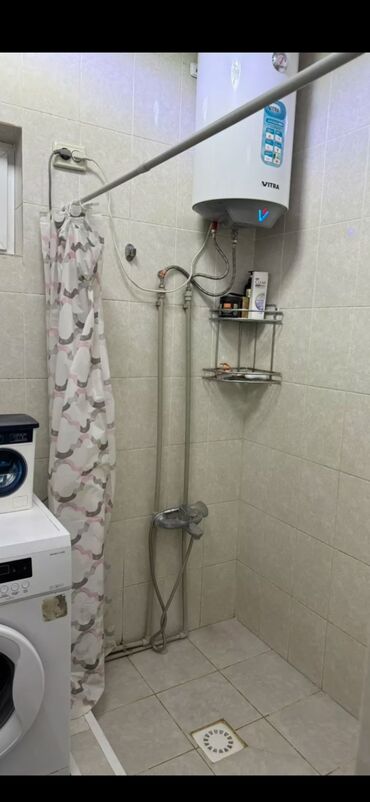 - Санузел: полностью в плитке, душевая зона с трапом в полу, смеситель и штанга с занавеской, электрический водонагреватель Vitra, полки для хранения, подключение под стиральную машину.