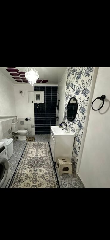 - Санузел: совмещённый, душевая зона, унитаз, раковина с тумбой, зеркало, стиральная машина, вытяжка/форточка, полотенцесушитель. Стены — комбинированная плитка (тёмно‑синяя глянец и светлые панно с узором), на полу плитка, дополнительные аксессуары (держатели, коврики).