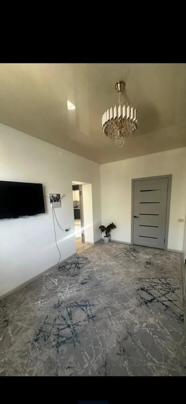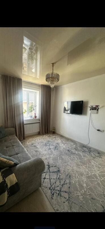 - Гостиная с диваном, ТВ на стене, потолочная люстра, плотные шторы.