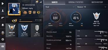 - Сезонная статистика: K/D 0.91, винрейт 49%, 79 матчей, 39 побед / 40 поражений, точность 10.0%, хедшоты 56.4%, выстрелов 14 774