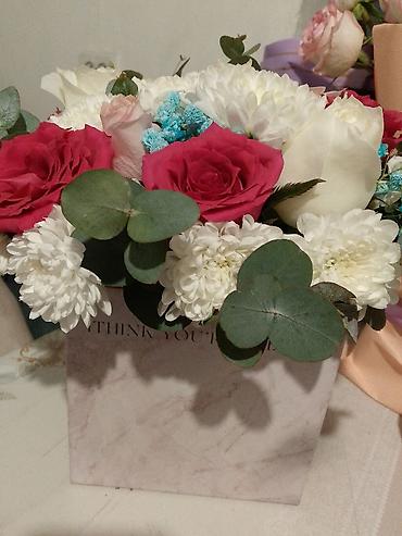 - Композиция в коробке: розы малинового и белого оттенка, нежные розовые бутоны, белые кустовые хризантемы, декоративная бирюзовая гипсофила и веточки эвкалипта. Оформление в коробке с мраморным рисунком и надписью.