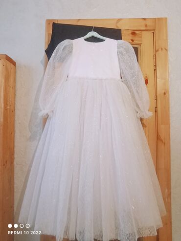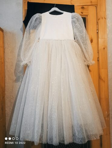 Нарядное детское платье белого цвета - Силуэт: пышная юбка в пол/миди с многослойным фатином, создающим объем и легкость. - Верх: атласный лиф с мягкими складками. - Рукава: длинные, полупрозрачны...