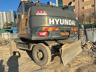 Колёсный экскаватор Hyundai (серия H) с фронтальным ковшом. Основные характеристики: - Колёсная база: 4x4, дорожные шины для работы на стройплощадках и в городе. - Гидравлическая стрела с мощными ...
