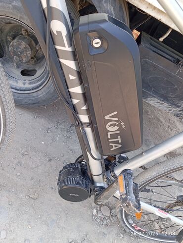 Электрический велосипед Giant с серебристой рамой и черными элементами. Оснащен батареей Volta и центральным двигателем, что обеспечивает комфорт при езде. Велосипед имеет дисковые тормоза для надежного торможения и амортизационную вилку для сглаживания неровностей дороги. Подходит для различных поездок, от городских до легкого бездорожья.акумлятор заменены на новые. матор фирмы Bafang качества отличное,48 ватт 750 ватт