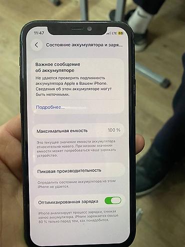 - Аккумулятор: в разделе «Состояние аккумулятора» отображается 100% максимальной ёмкости; имеется уведомление «Не удаётся проверить подлинность аккумулятора Apple…»