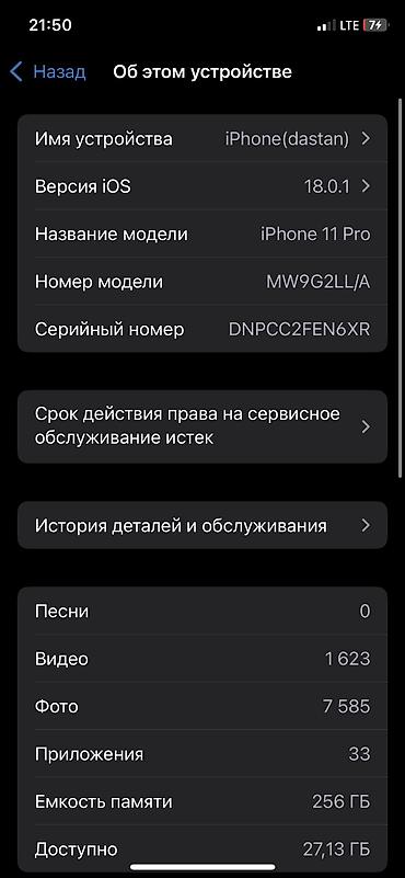 IPhone 11 Pro, 256 ГБ, цвет Silver Характеристики и детали: - Модель: iPhone 11 Pro (номер модели MWC82KH/A) - Память: 256 ГБ, доступно ~238,9 ГБ - iOS: версия 26.4.1 - Дисплей Super Retina XDR (...