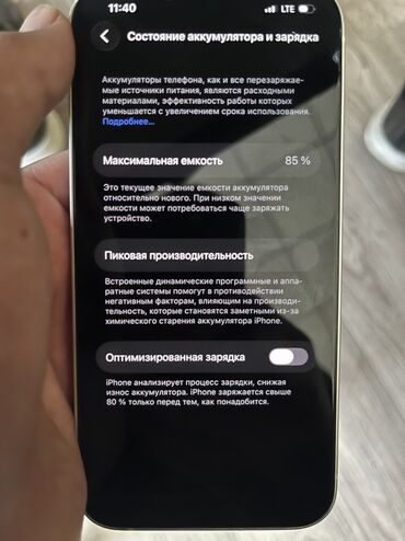 Изображение экрана «Состояние аккумулятора»: максимальная ёмкость 85%, включена функция «Оптимизированная зарядка».