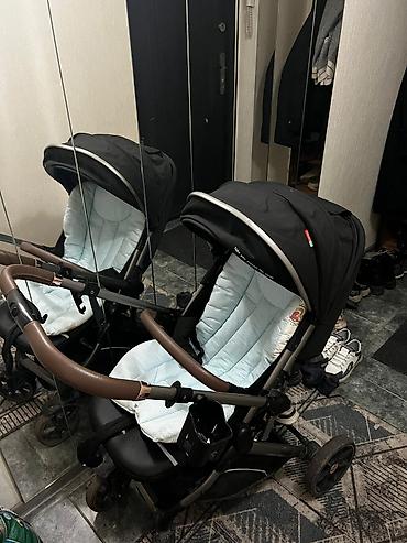 1) Коляска прогулочная: - Цвет: коричневый/оранжевый с бежевыми вставками. - Большой капюшон с окошком. - Столик-перекладина перед ребенком с подстаканником. - Регулируемая спинка (виден рычаг/фикс...