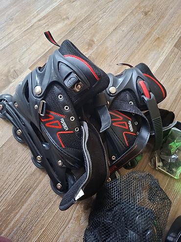- Роликовые коньки FORER (раздвижная конструкция, фиксируются баклей, липучкой и шнуровкой; колеса на раме, тормоз на правом ботинке).