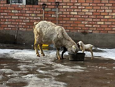 - У козы выраженное вымя, кормит двух козлят (на фото – сосут и рядом с кормушкой).