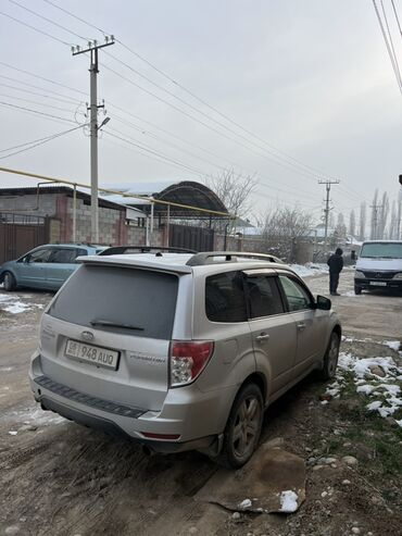 Subaru Forester (третье поколение, рестайлинг) — серебристый кроссовер с полным приводом Symmetrical AWD. Кузов 5‑дверный, рейлинги на крыше, задний спойлер. Светотехника: передние противотуманные фары, задние комбинированные фонари. Литые диски, дисковые тормоза по кругу, брызговики.