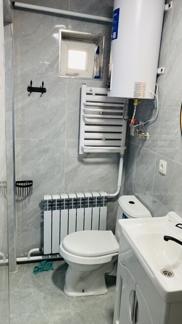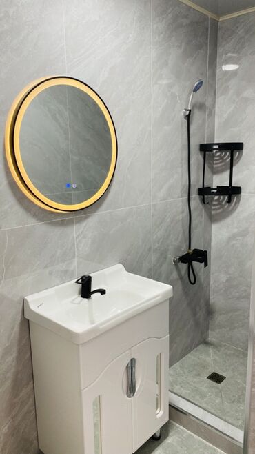 - Санузел совмещенный: душевой уголок с трапом и стеклянной перегородкой, умывальник на тумбе, зеркало с подсветкой, унитаз.