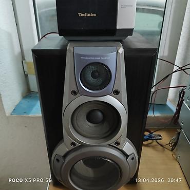 - Полный комплект акустики Technics: две напольные/полочные трёхполосные колонки с крупными сабвуферными НЧ‑диффузорами, два тыловых/сателлитных динамика и центральный спикер — готовая конфигурация для стерео и домашнего кино.