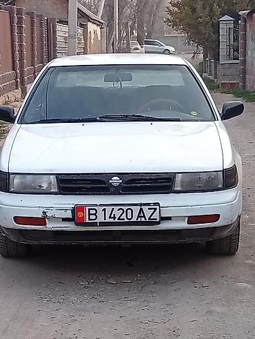 Седан Nissan (поколение начала 90‑х). Кузов белый, 4 двери, тонированные стекла, черные зеркала и молдинги, штампованные стальные диски. Фары и поворотники в едином блоке, передний и задний бамперы...