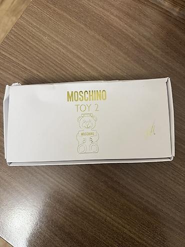 - Фирменная упаковка Moschino с бело-золотым оформлением и тиснением.