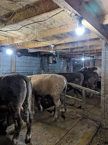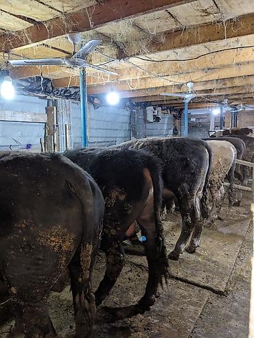 Бык мясного направления. - Крупный, мощный тип телосложения, широкая грудь и развитая мускулатура. - Окрас темно-бурый, короткая гладкая шерсть. - Содержится на привязи в стойле, спокойный характе...