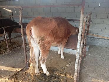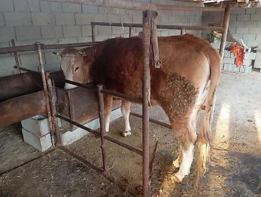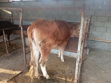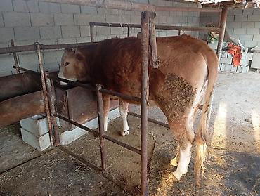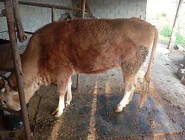 Бык мясного направления, черной масти, рогатый. Установлены бирки в ушах. Телосложение крепкое, широкая грудь и спина, хорошо развитая мускулатура крупа и бедер. Содержание на привязи в крытом сара...