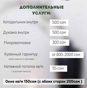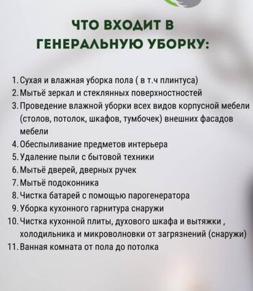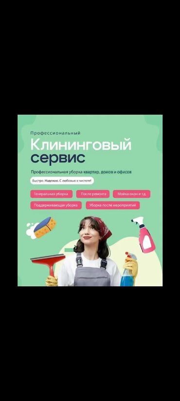 Уборанын бардык турун жасайбыз. ген уборка 100 с уборка после ремонта 120 уборка после квартирантов 150