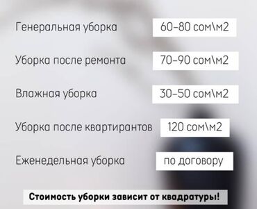 Профессиональные клининговые услуги для квартир, домов и коммерческих помещений. Виды работ и цены (согласно прайсу на фото): - Уборка после ремонта — 120 сом/м² - Влажная уборка — 80 сом/м² - Ген...
