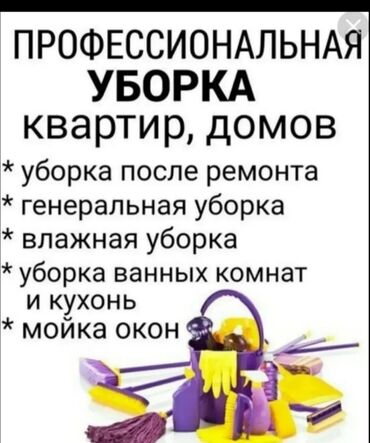 Профессиональная уборка квартир и домов Перечень услуг: - Регулярная уборка (раз в неделю или по вашему графику) - Генеральная уборка - Влажная уборка всех комнат - Уборка ванных комнат и кухонь -...