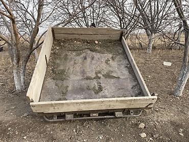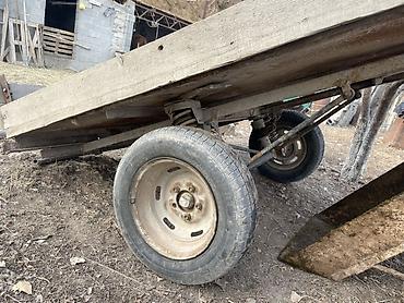 Дополнительно на фото — двухосный самодельный прицеп с деревянной платформой и металлической рамой: рессорная подвеска, колёса на штампованных дисках, механизм подъёма платформы (опрокидывающийся кузов).