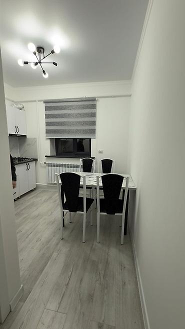 - Кухня: линейный гарнитур в белом цвете с черной столешницей, мойка с черным смесителем, варочная панель на 2 конфорки, вытяжка, верхние и нижние шкафы для хранения, фартук под мрамор. В обеденной зоне — стол со столешницей под камень и 4 стула.