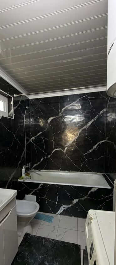 - Санузел с ванной: облицовка под черный мрамор, подвесной душ, умывальник с тумбой, унитаз, стиральная машина, водонагреватель.